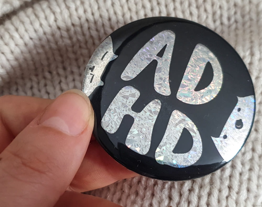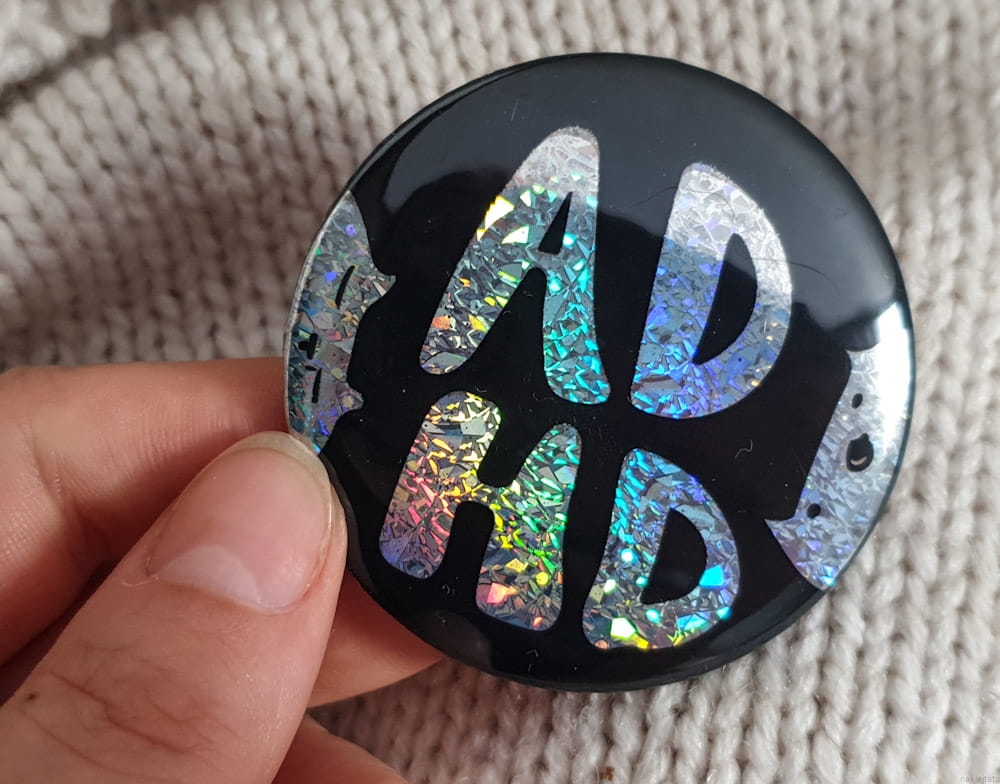 My ADHD is holographic and nobody can convince me otherwise. So I`ve made a button. If your ADHD is holo too buy it because it looks amazing on jackets and tote bags, especially in direct sunlight (it`s so shinny!).
