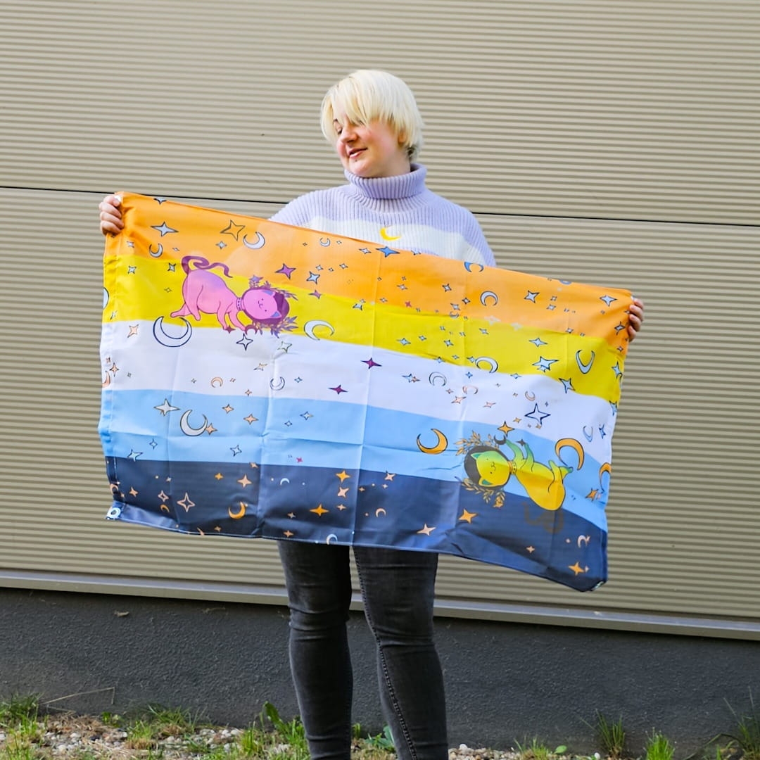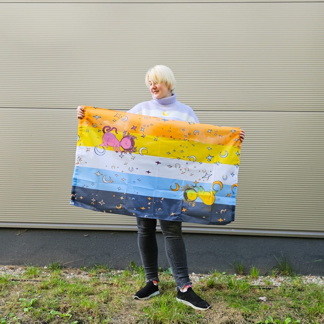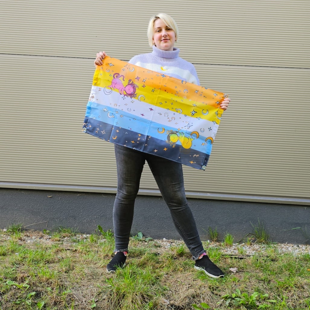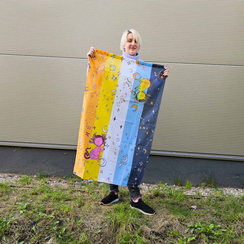 - strong, durable, and light fabric – 180g mesh – my pride flags are strong enough to hang outside because wind flows through the mesh instead of ripping it (as it can happen with pride flags made out of thinner polyester fabric)