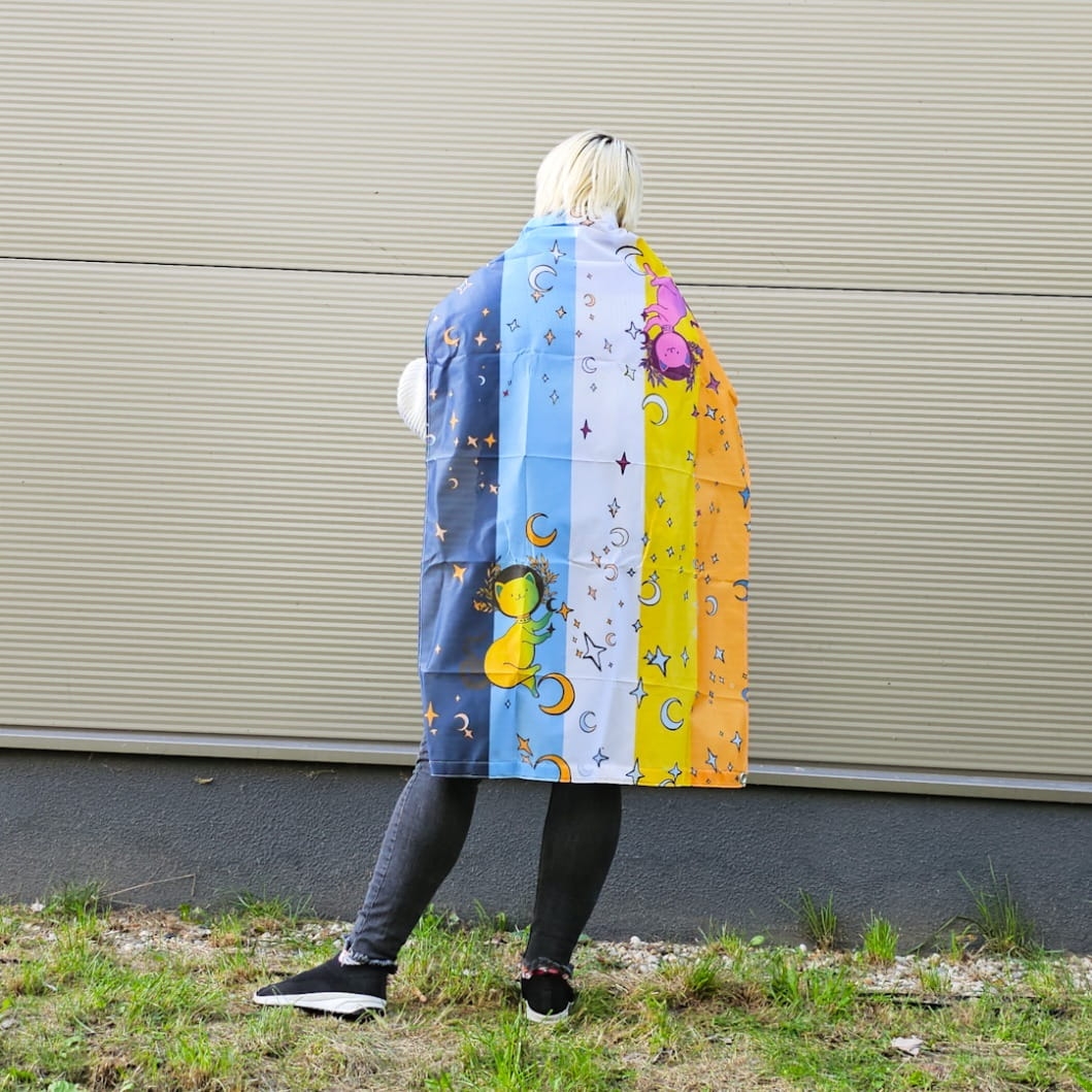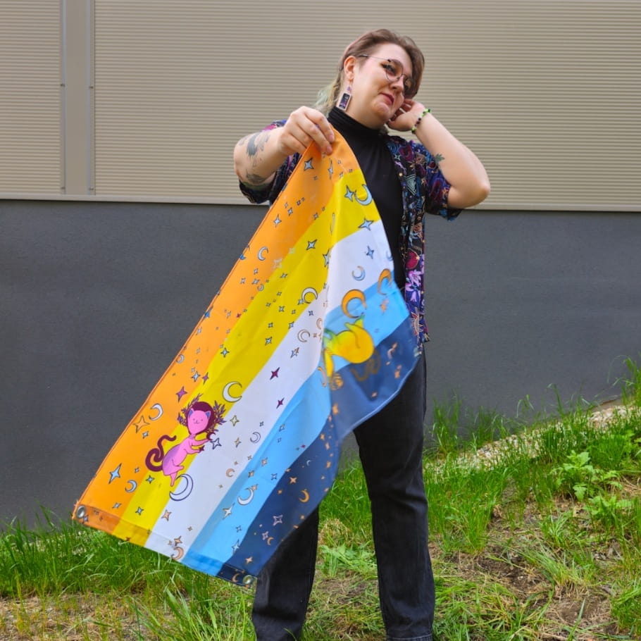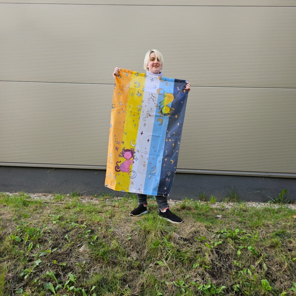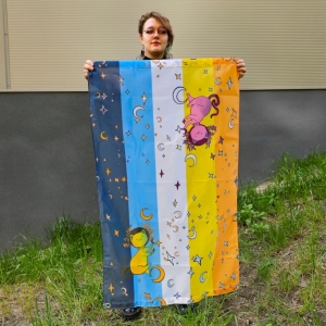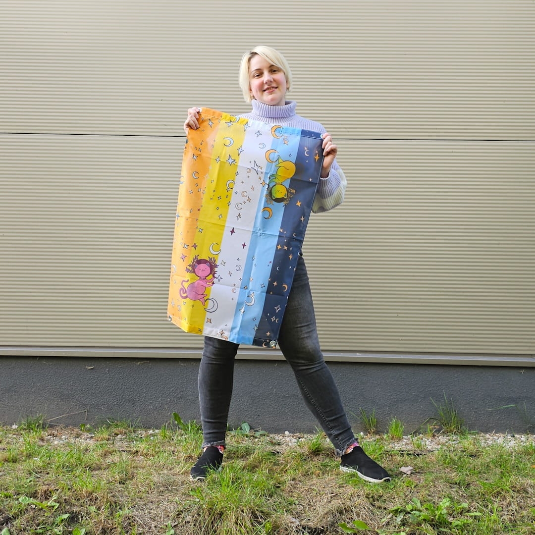 - strong, durable, and light fabric – 180g mesh – my pride flags are strong enough to hang outside because wind flows through the mesh instead of ripping it (as it can happen with pride flags made out of thinner polyester fabric)