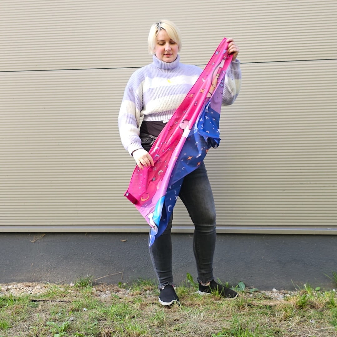 - strong, durable, and light fabric – 180g mesh – my pride flags are strong enough to hang outside because wind flows through the mesh instead of ripping it (as it can happen with pride flags made out of thinner polyester fabric)