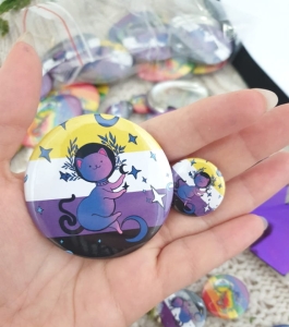 All my metal pin back buttons are sturdy and weatherproof (they don`t like being submerged in water tough). Designs are created by me, printed, and assembled by a small polish company.