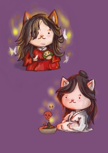 Xie Lan I Hua Cheng w wersji kotkowej, bo uwielbiam i ich i kotki. Rysowane i drukowane z pasją i miłością na Śląsku, a trafić może gdziekolwiek. Na butelkę z wodą, lodówkę, komputer...