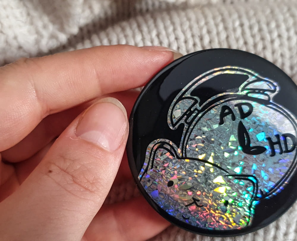 Did you know that tote bags can feel lonely without at least a few nice buttons or pins? Make your tote bag happy and buy a great button designed by me. And yes, my ADHD is holographic.