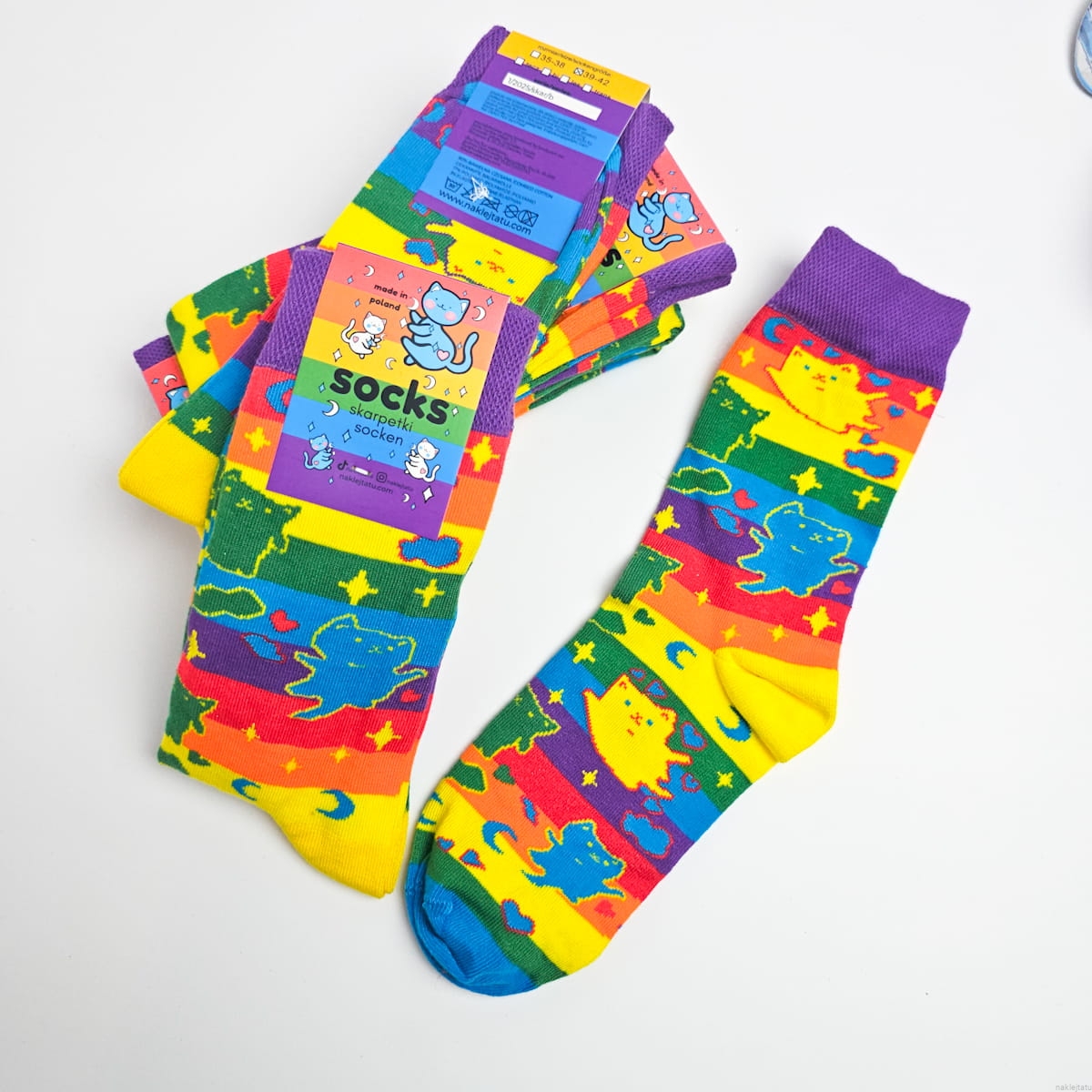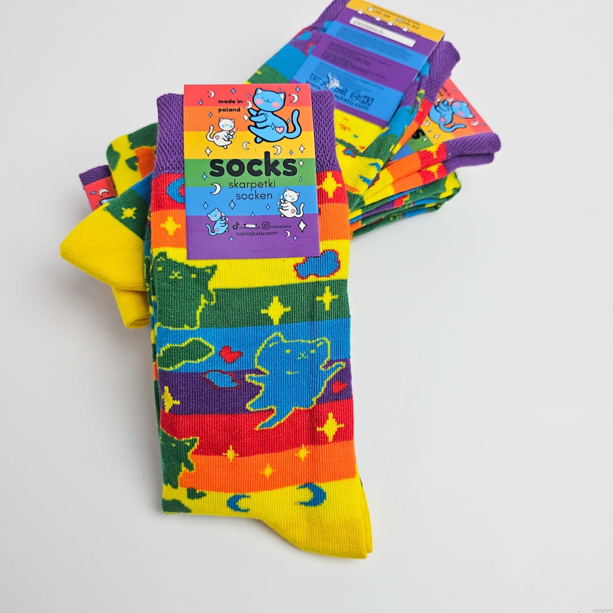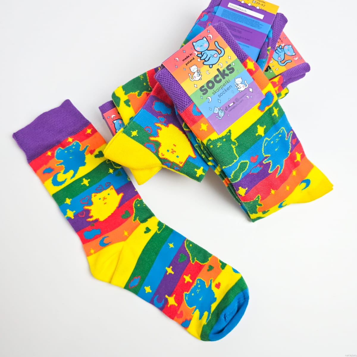 It can be fun, colorful and filled with happy cats. Socks with rainbow flag and cats are waiting for you and your friends!
