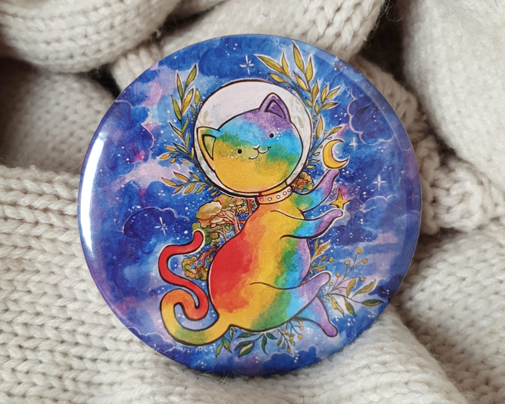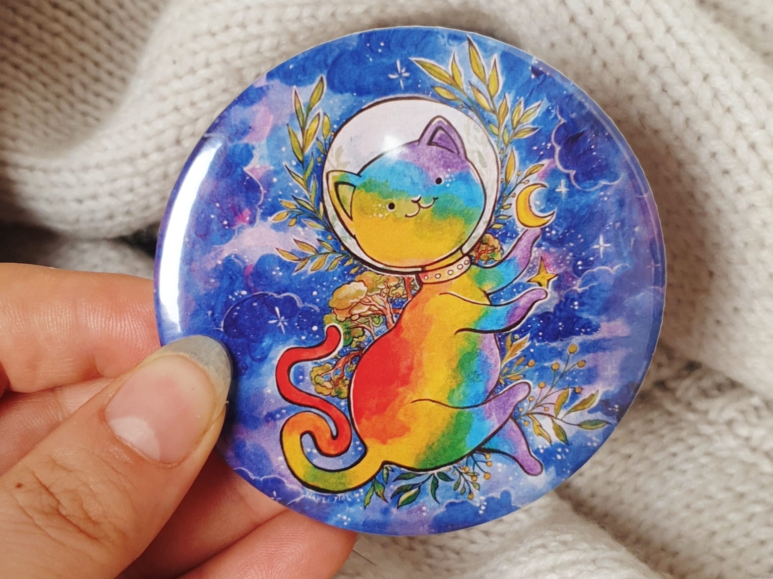 Bardzo duża przypinka z cudownie kolorowym kotem na tle nocnego nieba