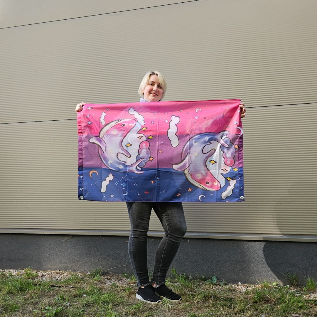 Flaga ma 110 x 70 cmi cztery metalowe oczka w rogach, dzięki którym łatwiej zawiesisz ją w domu, na balkonie, na własnych ramionach albo drzewcu podczas marszu, czy gdzie ci się tam jeszcze uda. I już możesz demonstrować zarówno piękne kolory flagi biseksualnej jak i urocze kosmiczne kitku.
