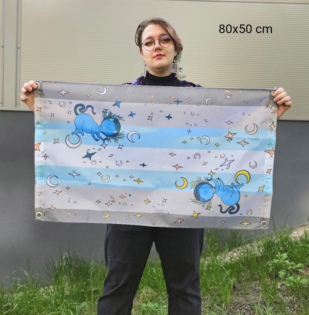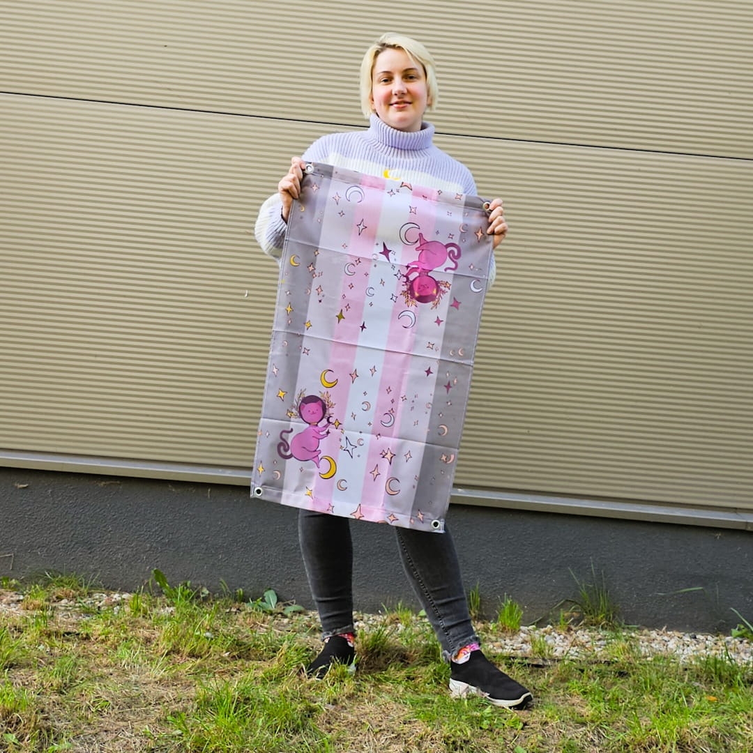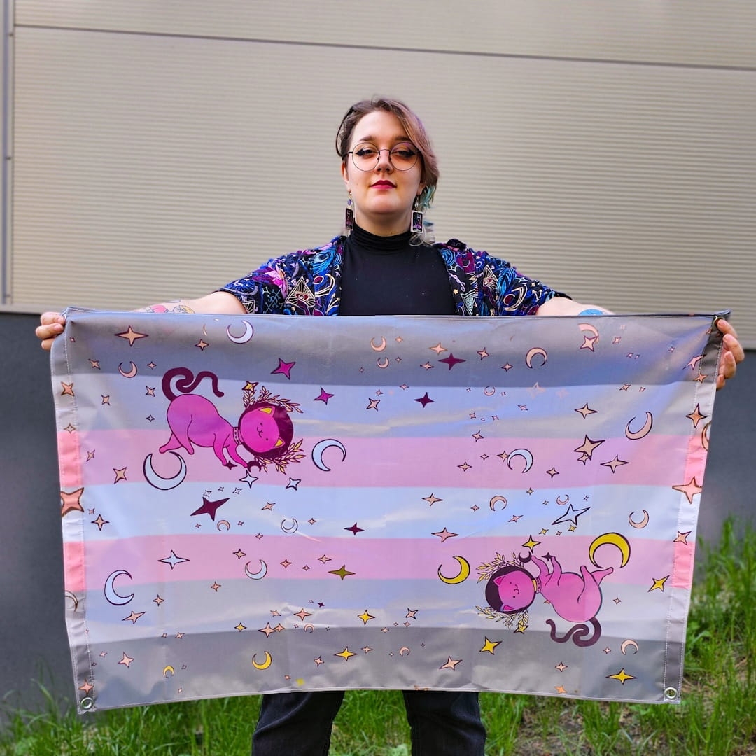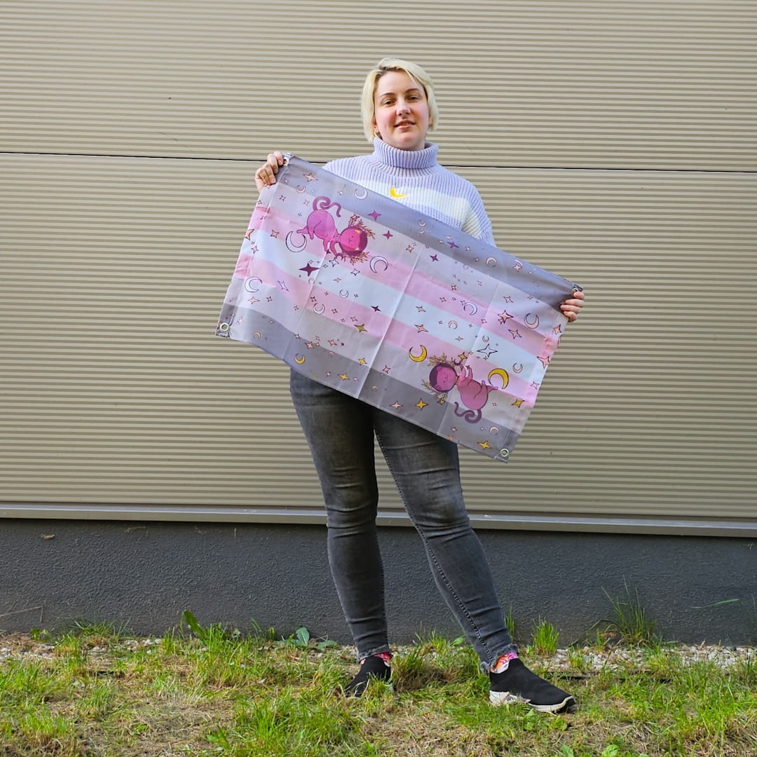 Poznaj idealną flagę dla kogoś kto identyfikuje się jako demigirl i kocha koty. Flaga zaprojektowana, drukowana i szyta w Polsce przez naklejtatu, projekt, w którym działają tylko queerowe i nieneurotypowe osoby.
