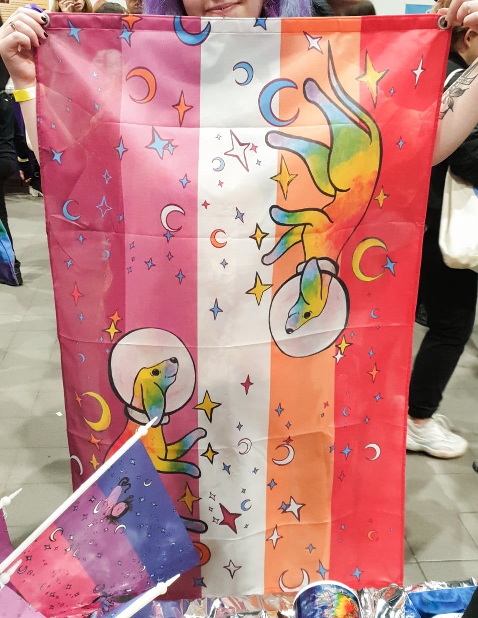 Chcesz, żeby twoja lesbijska flaga była bardziej twoja i osobista? Wybierz flagę z psami! Jest wyjątkowa, inna, urocza i oparta o ręcznie rysowaną ilustrację autorstwa Cyd.