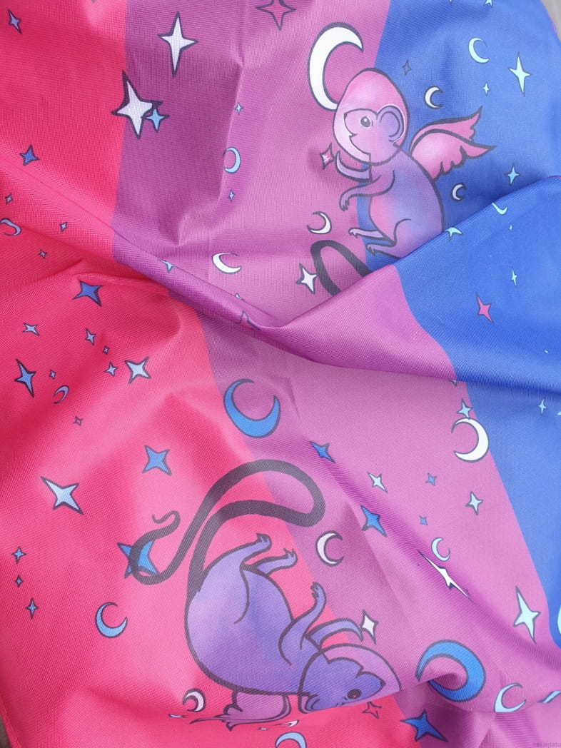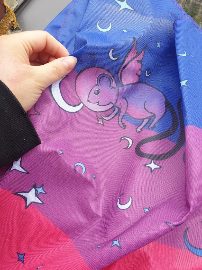 Flaga ma 112 na 70 cm i jest odporna zarówno na pranie jak i prasowanie w niskich temperaturach (tak, wiem że niektórych irytują niedające się wyprasować zagięcia na ich flagach). Wzór jest widoczny zarówno z jednej jak i z drugiej strony (w lustrzanym odbiciu). Dostępne są też opcje 150 na 92 i mini, 70 na 45 cm. Kolory i wzór długo pozostaną wyraźne dzięki świetnej jakości farbom. A do tego są kotki, więc są kotki. Tkanina jest też odporna na deszcz i słońce.