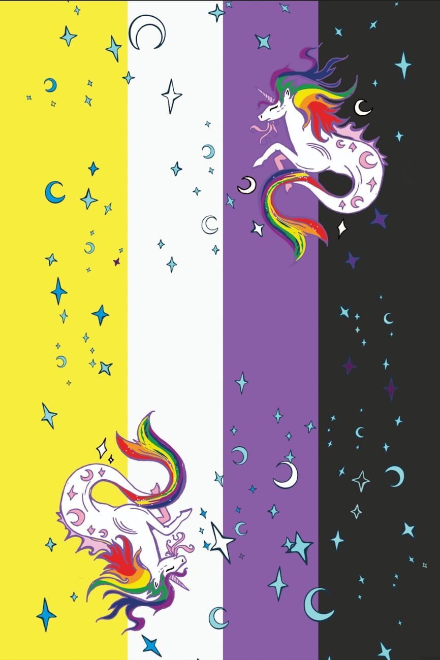 Flaga niebinarna z jednorożcami, które są hipokampami