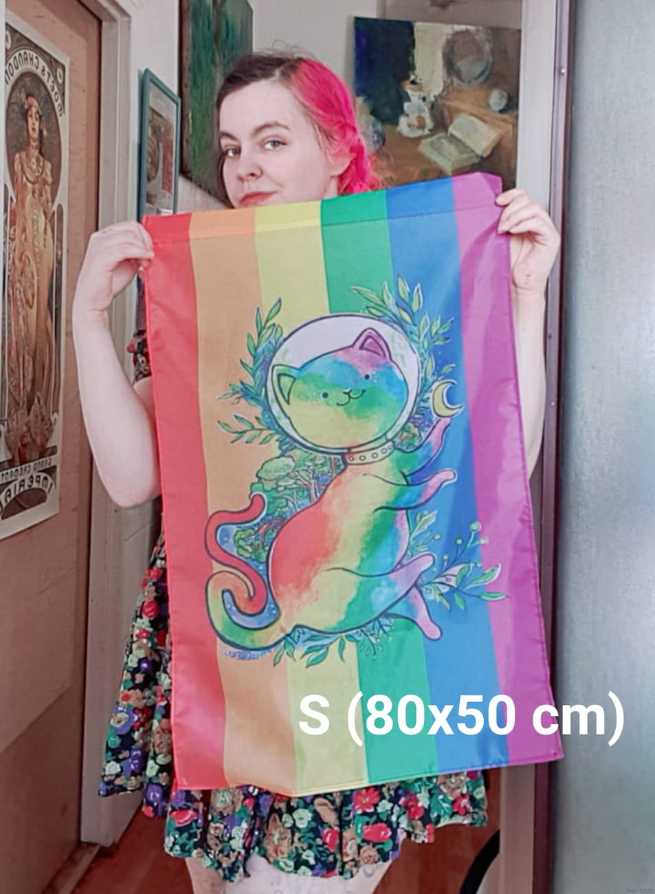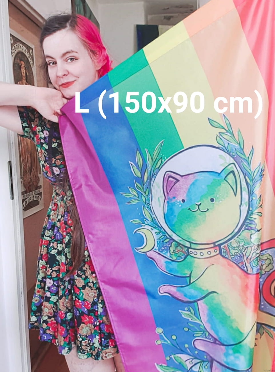 Flaga ma 112 na 70 cm, ma obszyte krawędzie i jest odporna zarówno na pranie jak i prasowanie w niskich temperaturach (tak, wiem że niektórych irytują niedające się wyprasować zagięcia na ich flagach). Wzór jest widoczny zarówno z jednej jak i z drugiej strony (w lustrzanym odbiciu). Kolory i wzór długo pozostaną wyraźne dzięki świetnej jakości farbom odpowrnym na światło słoneczne. A do tego są kotki, a wszystko z kotkami jest fajniejsze.