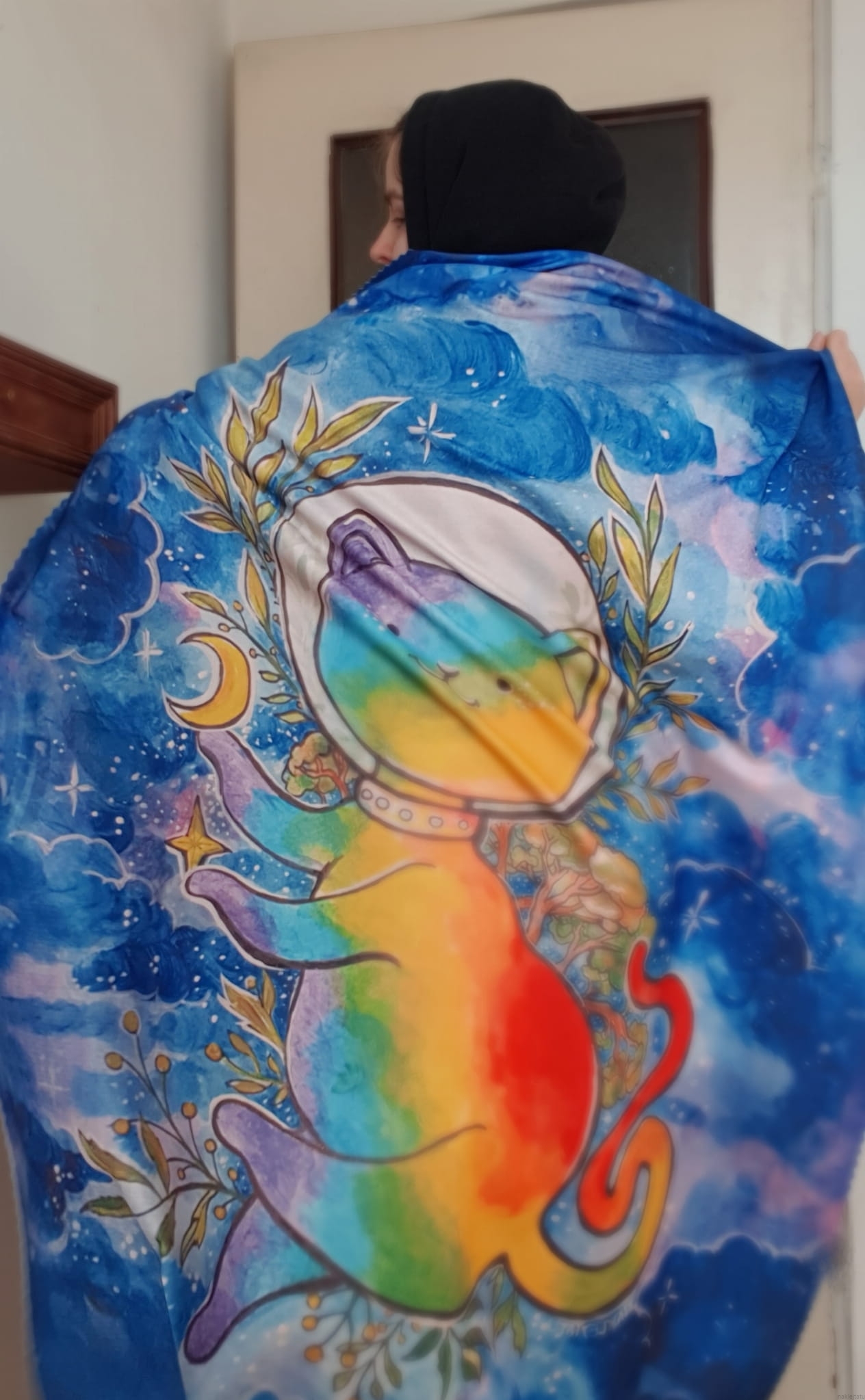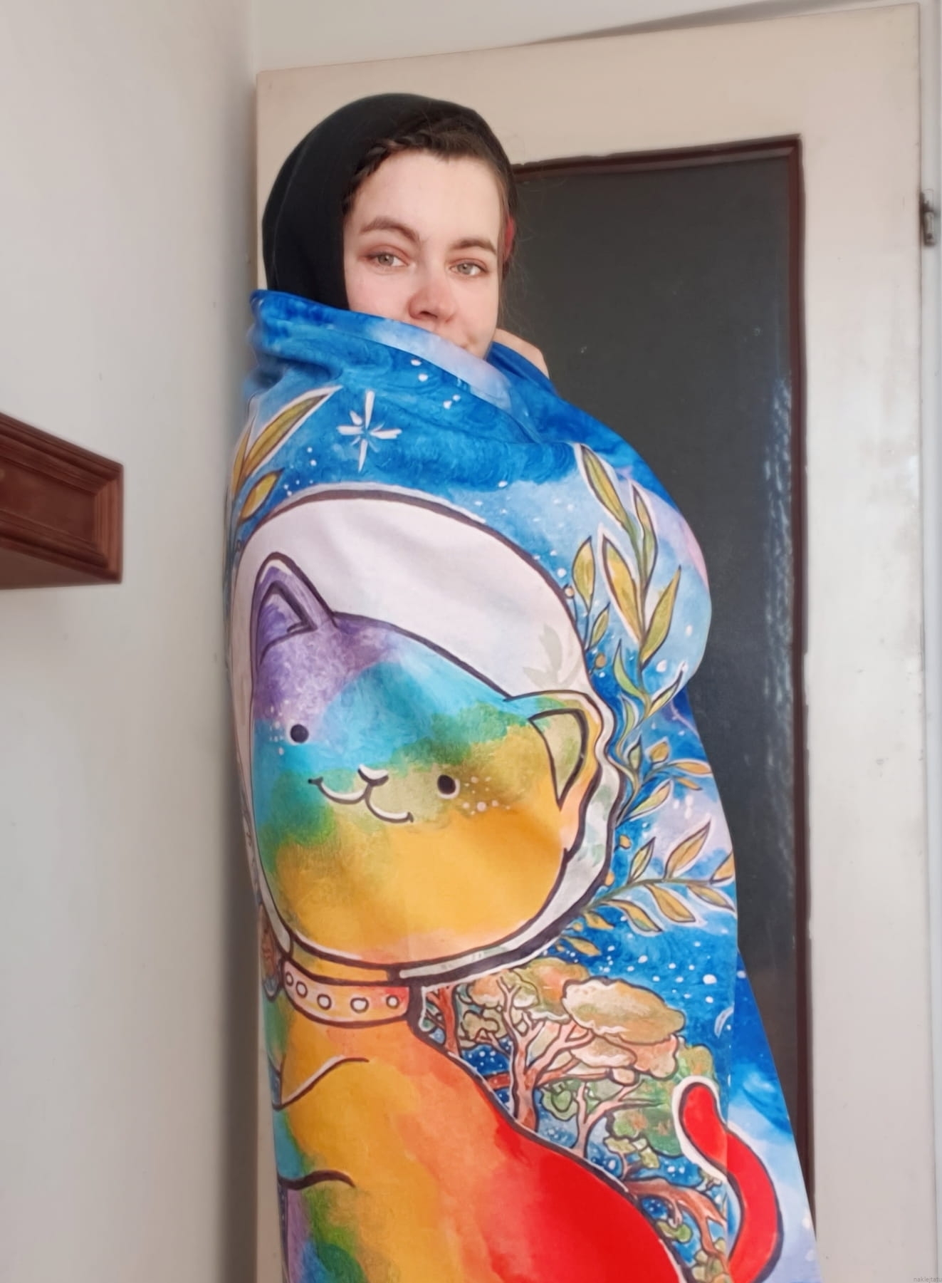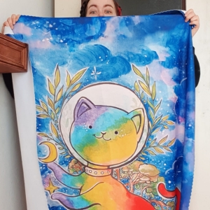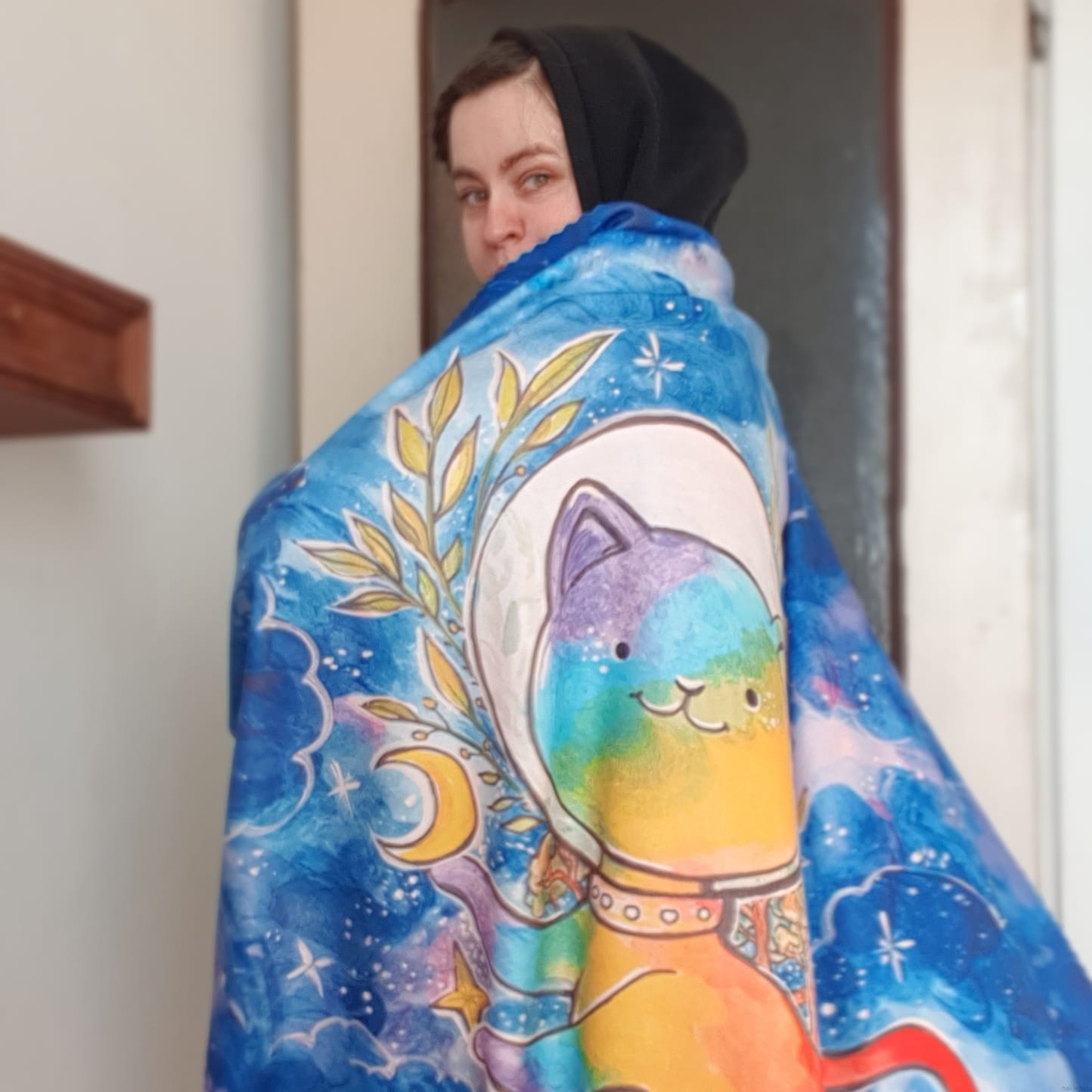 Zrobiło się zimno i szukasz czegoś w pięknych kolorach co cię przytuli i ogrzeje? Wybierz puchaty kocyk z przepięknym kotem astronautą na tle nocnego nieba. Koc wykonany został na podstawie mojej oryginalnej ilustracji (która była okładką magazynu MLEM, a konkretniej numeru o kotach w kosmosie).