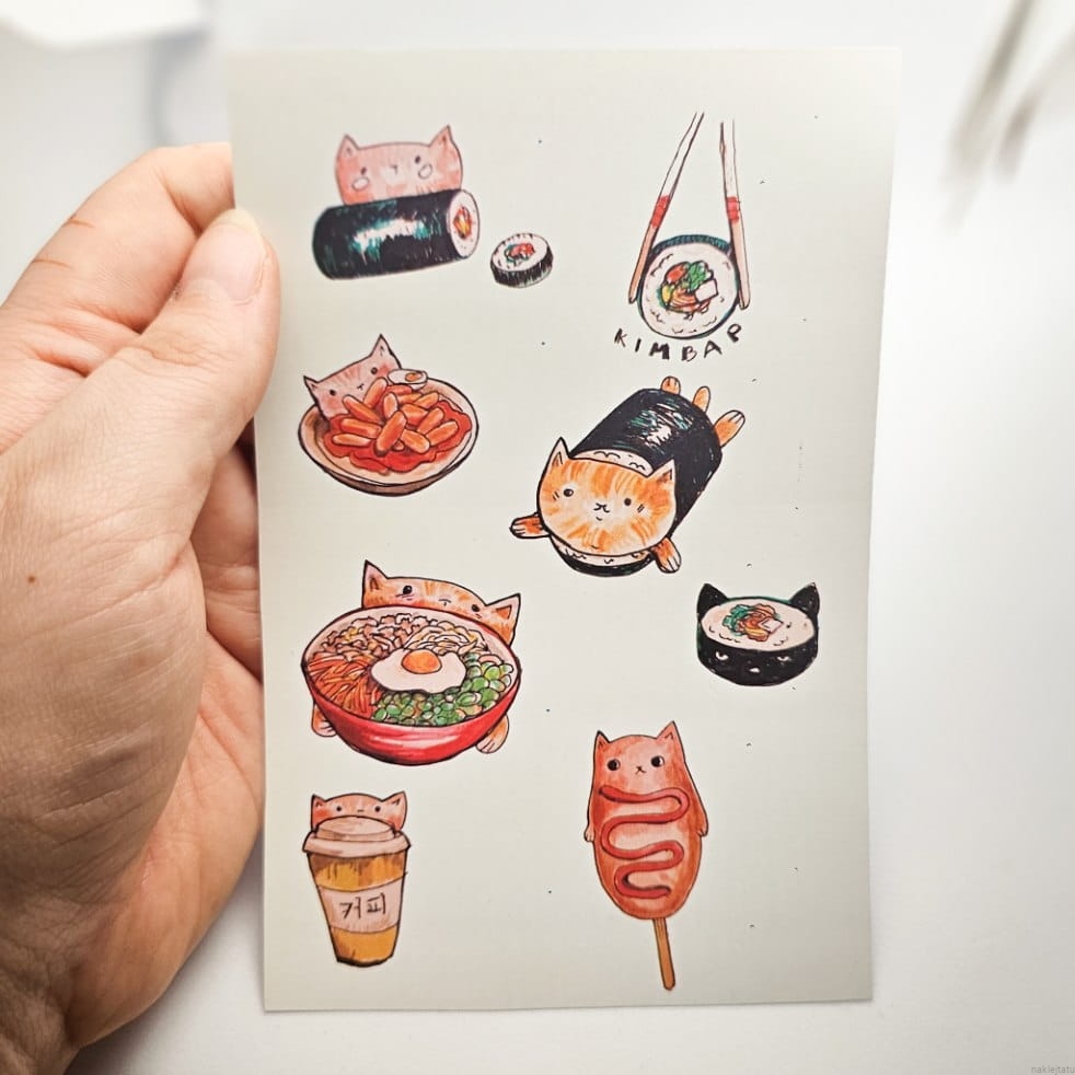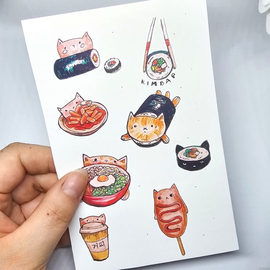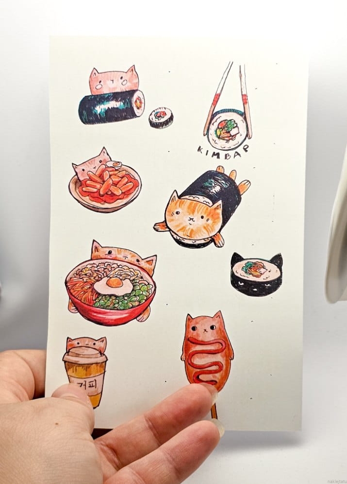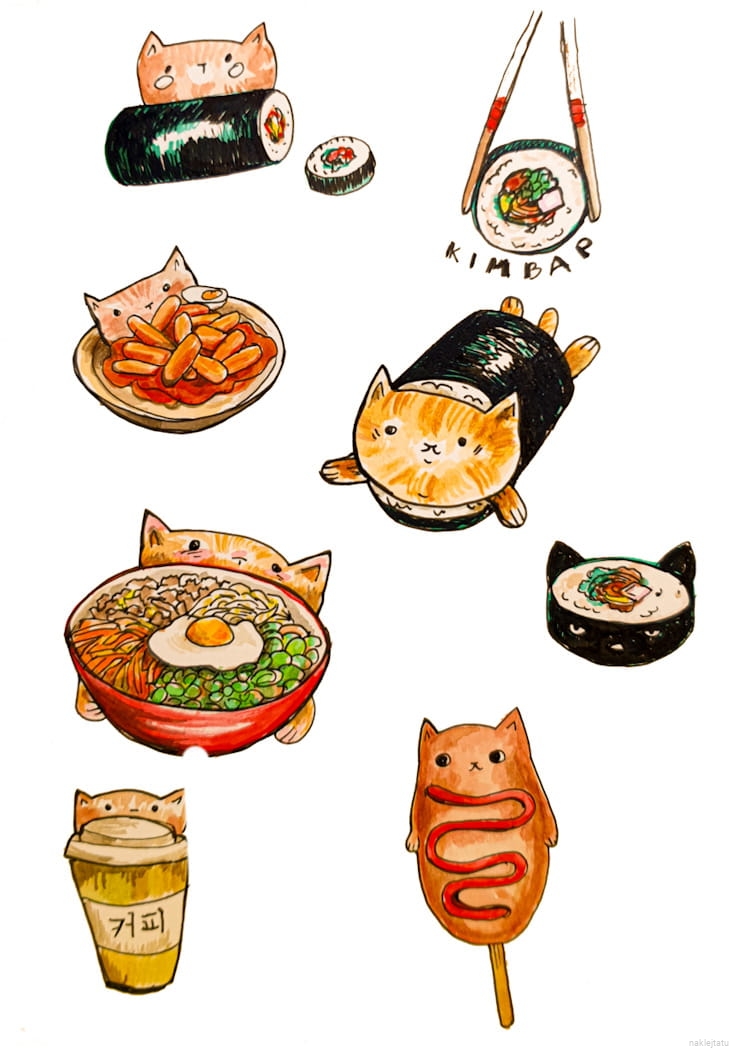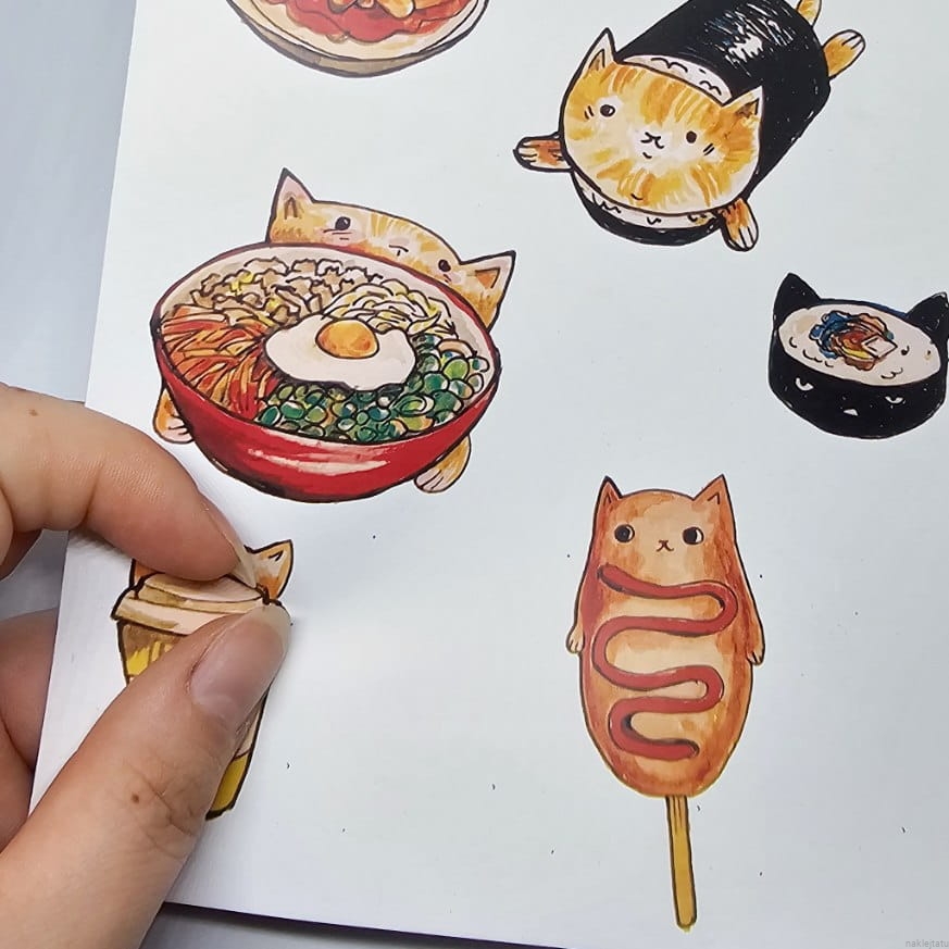 Zestaw naklejek z koreańskim jedzeniem i kotkami. Uroczy i bardzo apetyczny - idealnie sprawdzi się naklejony na telefon.