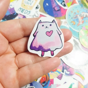 Jeżeli na twoim komputerze znajdzie się jeszcze 4 cm miejsca to właśnie tam idealnie dopasuje się ta urocza naklejka z kotkiem, który jest też duszkiem. Dużo uroczości, a sama naklejka jest trwała, bo wodoodporna i wydrukowana na folii.