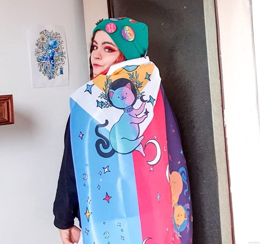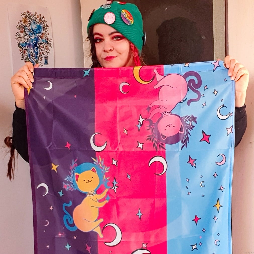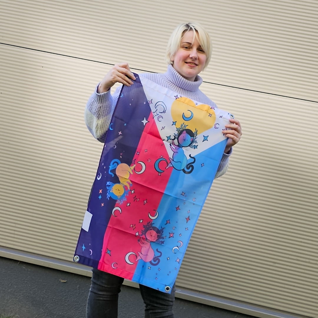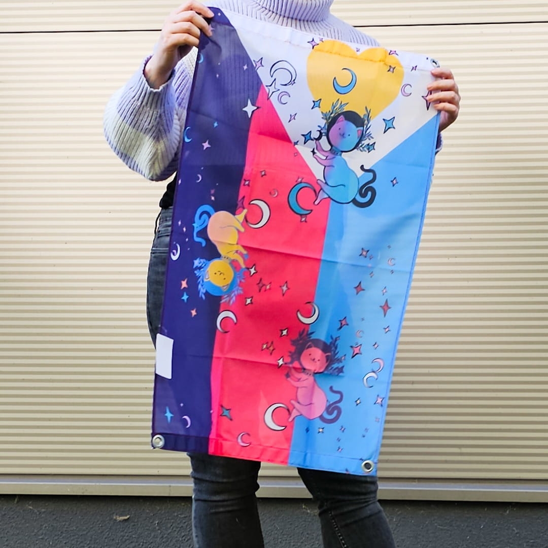 Zupełnie nowa flaga poly i zupełnie nie monogamiczna ilość kotków na fladze, bo co może być fajniejszego niż polykotki? Flagę możesz powiesić na ścianie (albo na suficie), zrobić z niej pelerynkę albo przyczepić do kija lub barierek na balkonie. Jedna flaga, a dużo różnych możliwości pokolorowania swojego domu.
