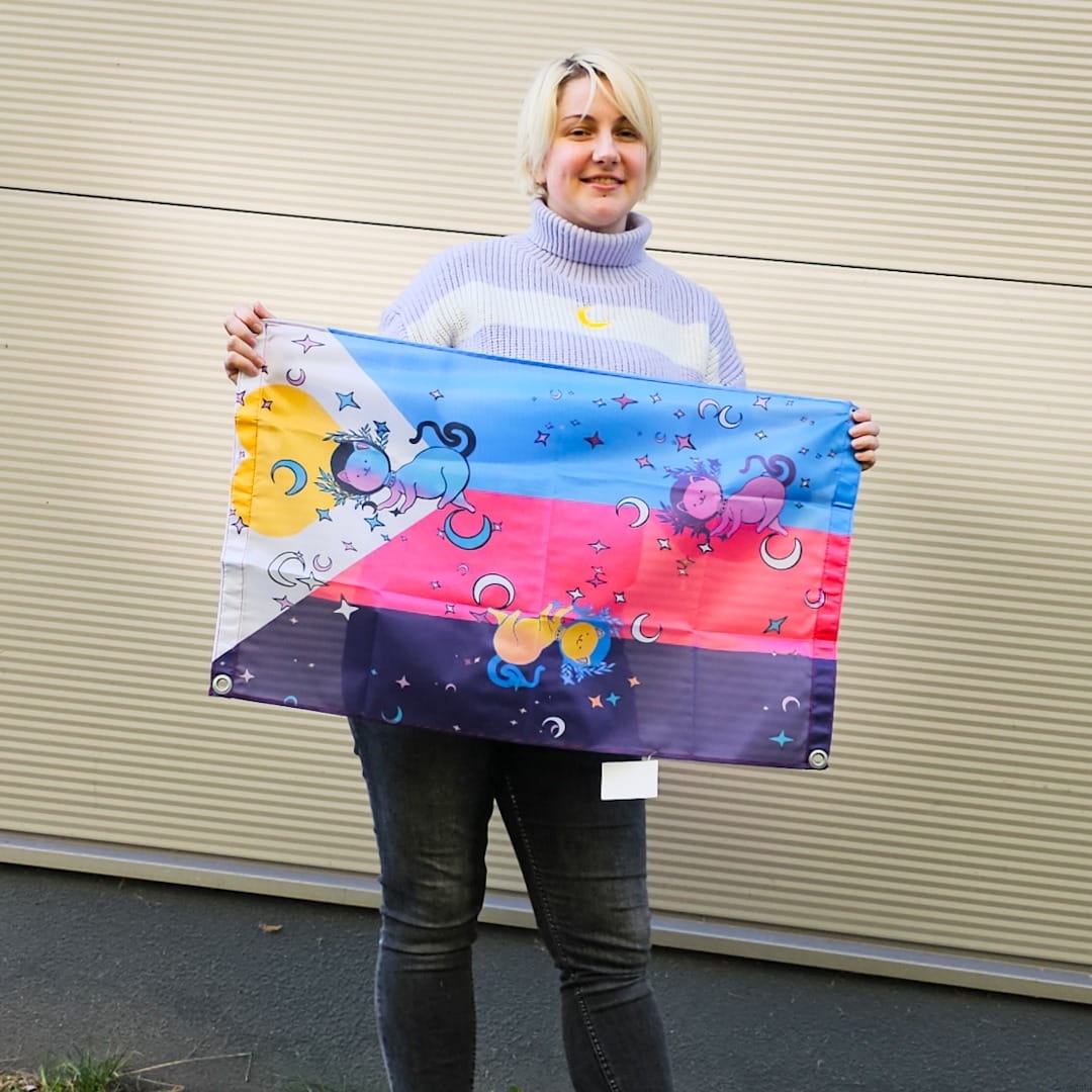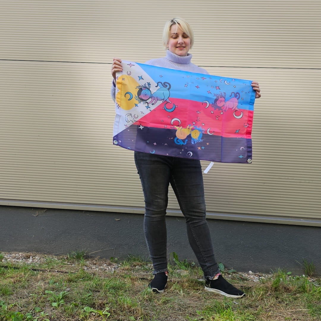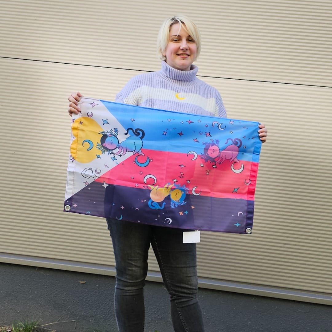 Zupełnie nowa flaga poly i zupełnie nie monogamiczna ilość kotków na fladze, bo co może być fajniejszego niż polykotki? Flagę możesz powiesić na ścianie (albo na suficie), zrobić z niej pelerynkę albo przyczepić do kija lub barierek na balkonie. Jedna flaga, a dużo różnych możliwości pokolorowania swojego domu.
