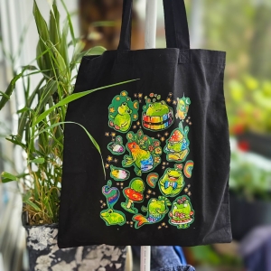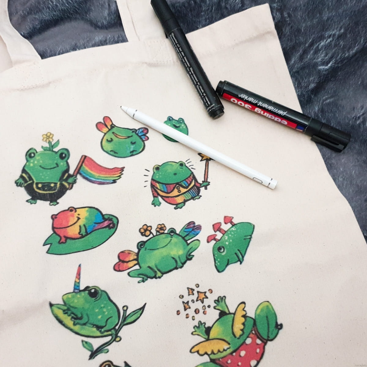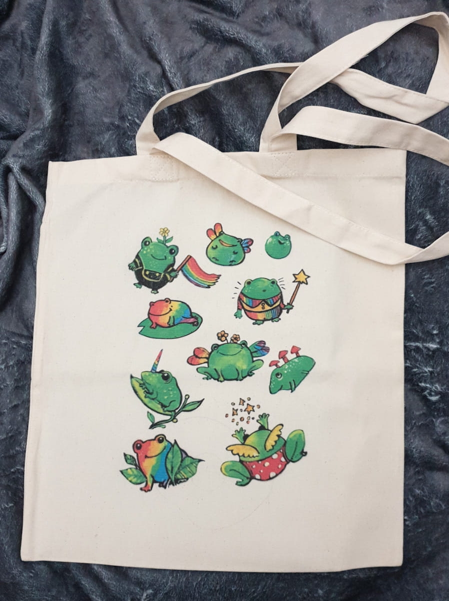 A na samej torbie bardzo dużo małych i uroczych żab.