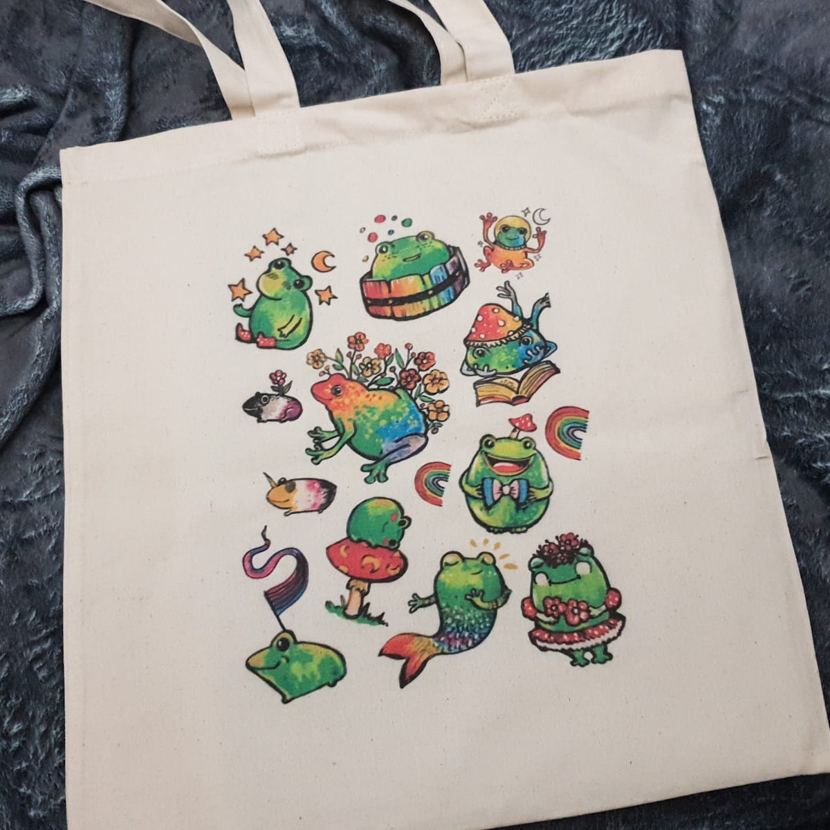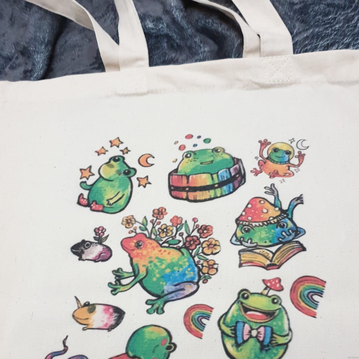 Jedna mała torba, a tyle tęczowych żab! Zresztą nie taka mała, bo to torba, która zmieści w sobie rzeczy do formatu A3? Oto i ona.